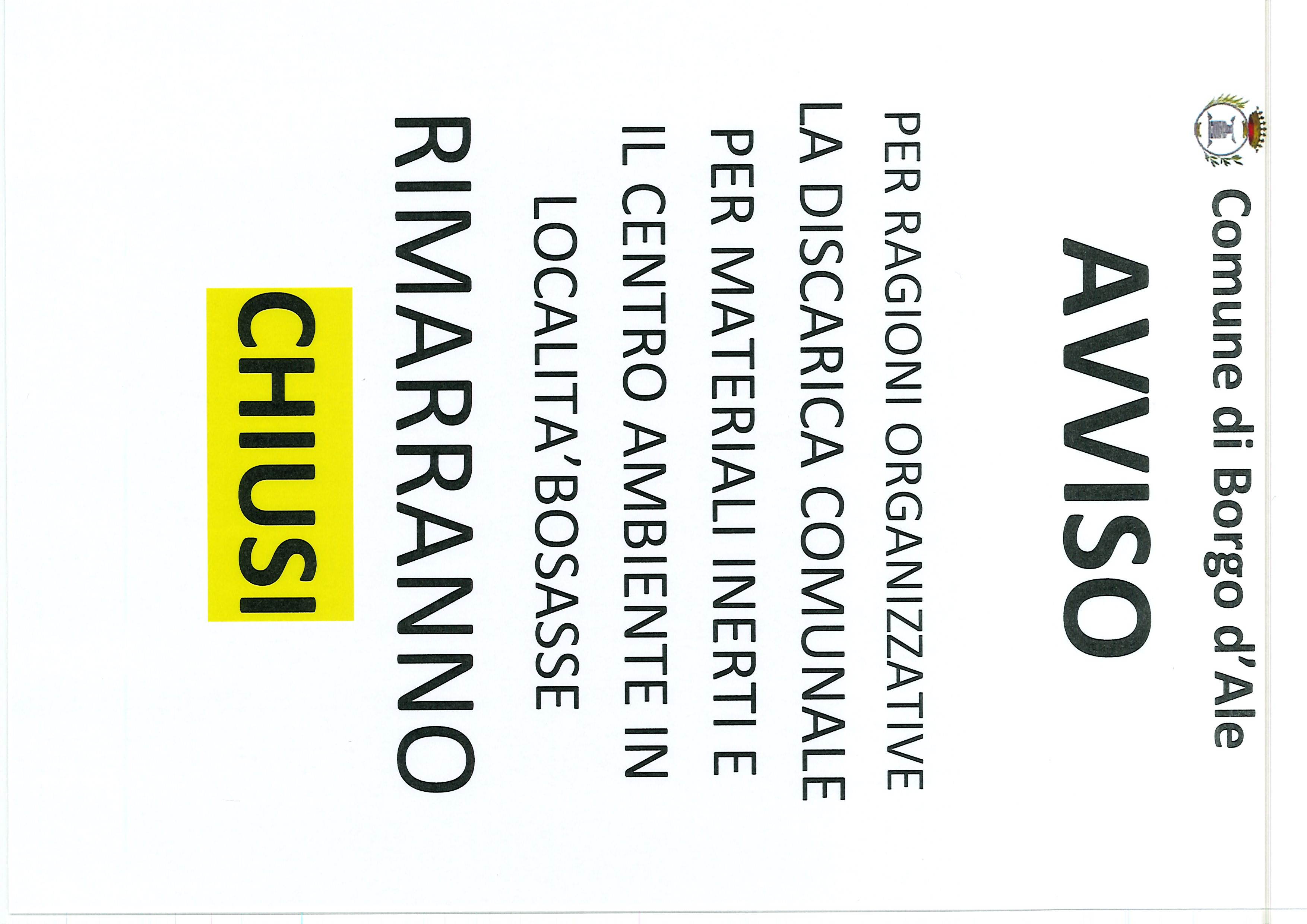 Si informa che, per ragioni organizzative, la discarica comunale per materiali inerti ed il centro ambiente in Località Bosasse rimarranno chiusi.