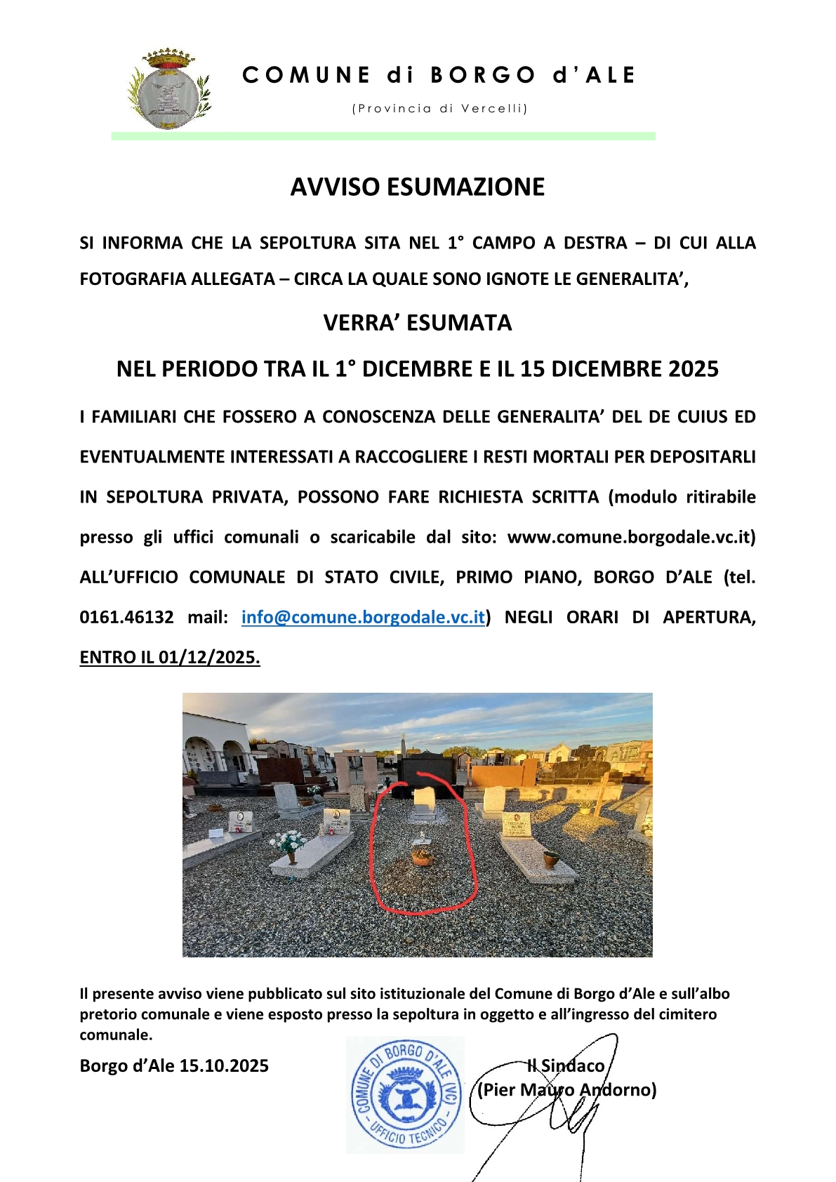 Avviso Esumazione sepoltura nel periodo tra il 1 dicembre e 15 dicembre 2025