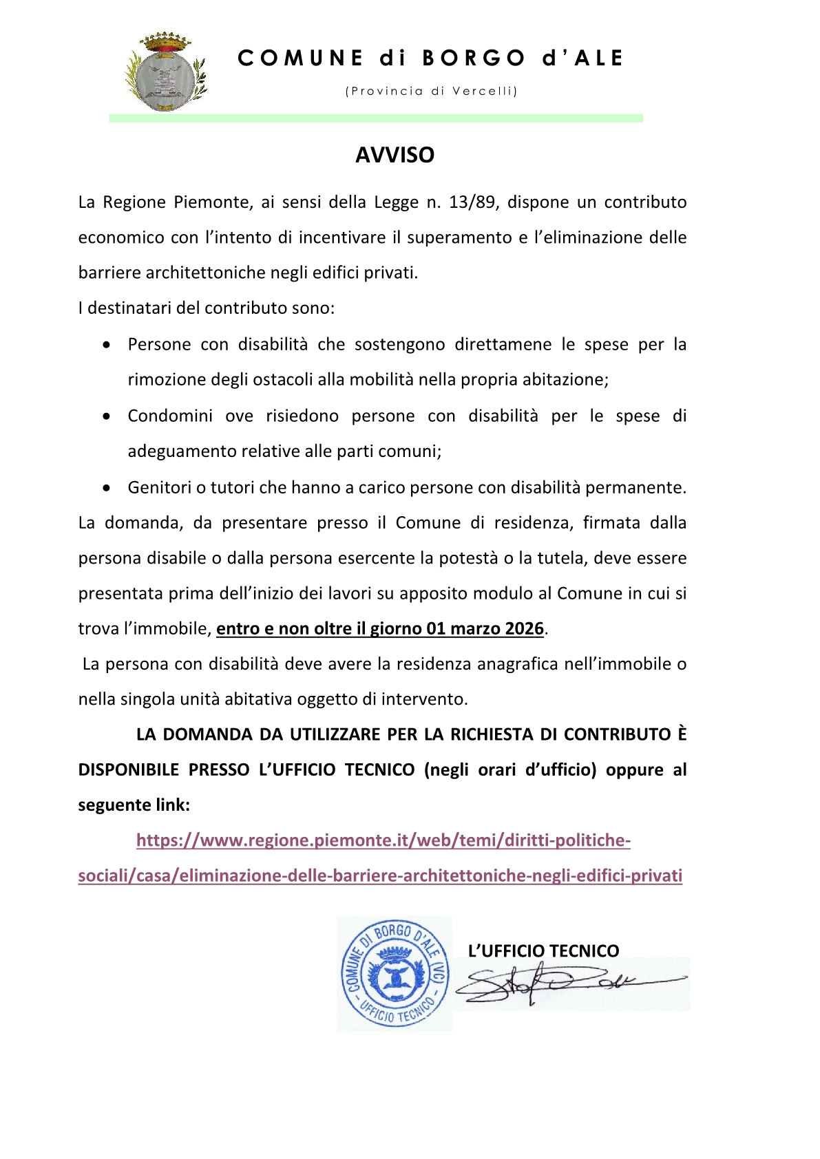 La domanda, da presentarsi entro e non oltre il 1° marzo 2026, da utilizzare per la richiesta di contributo, è disponibile presso l'Ufficio Tecnico comunale oppure al seguente link:
