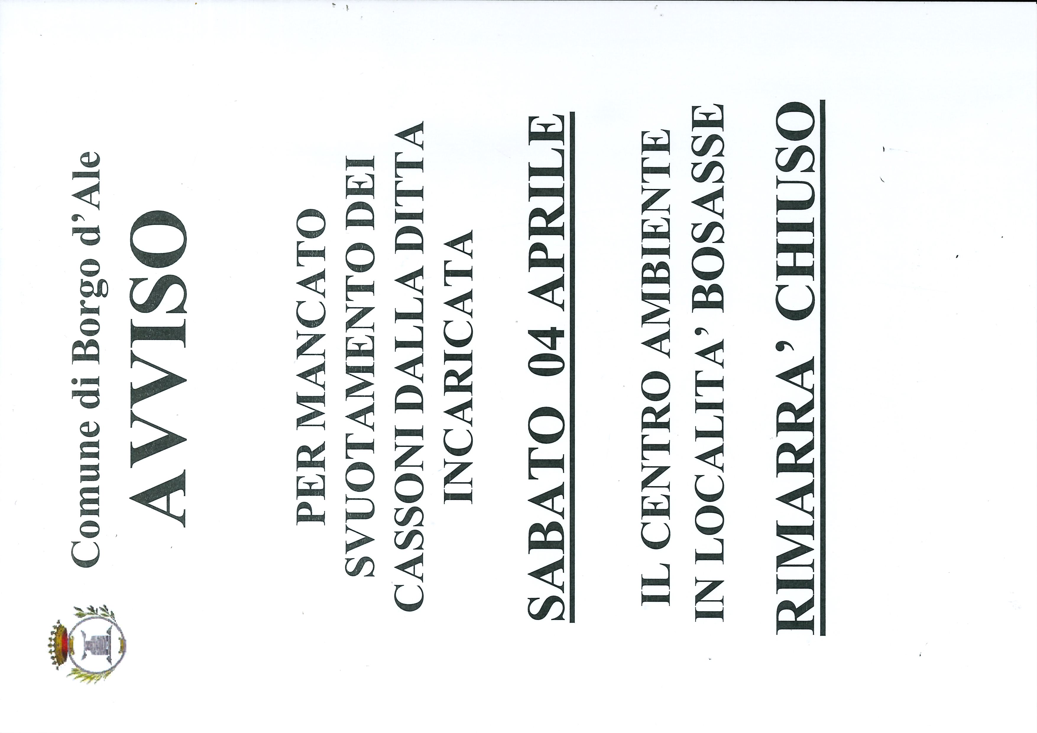 Per mancato svuotamento dei cassoni da parte della Ditta incaricata, sabato 04 aprile 2026 il Centro Ambiente in Località Bosasse rimarrà chiuso.